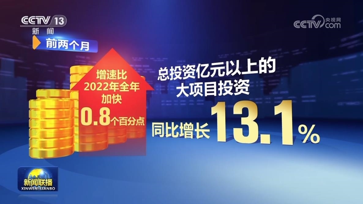 前兩個月,全國固定資產(chǎn)投資同比增長5.5%,增速比2022年全年明顯加快,其中,總投資億元以上的大項目投資同比增長13.1%,增速比2022年全年加快0.8個百分點。