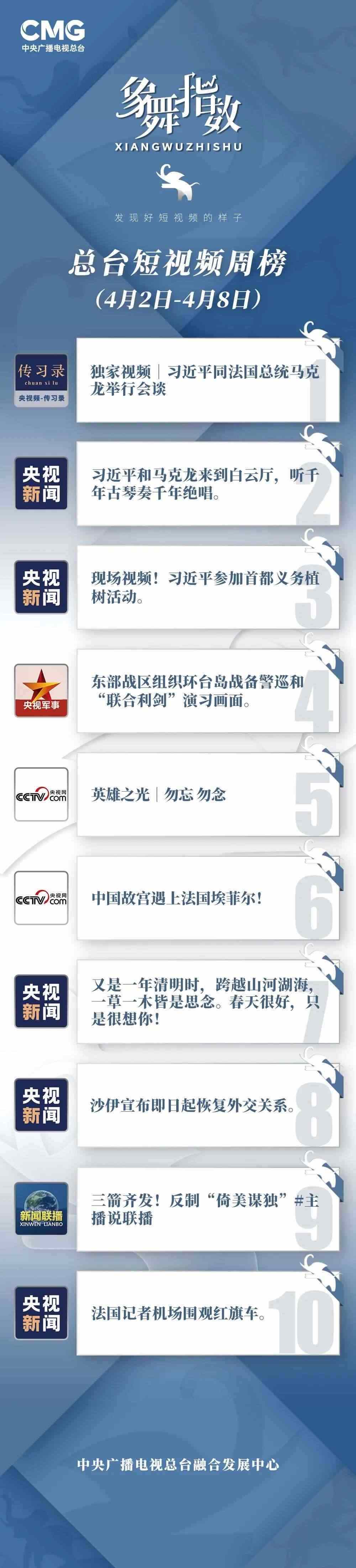 中央廣播電視總臺(tái)“象舞指數(shù)”評(píng)議品牌,推出主流媒體短視頻周榜、總臺(tái)短視頻周榜。在2023年4月2日—4月8日,這些內(nèi)容引發(fā)大眾關(guān)注: