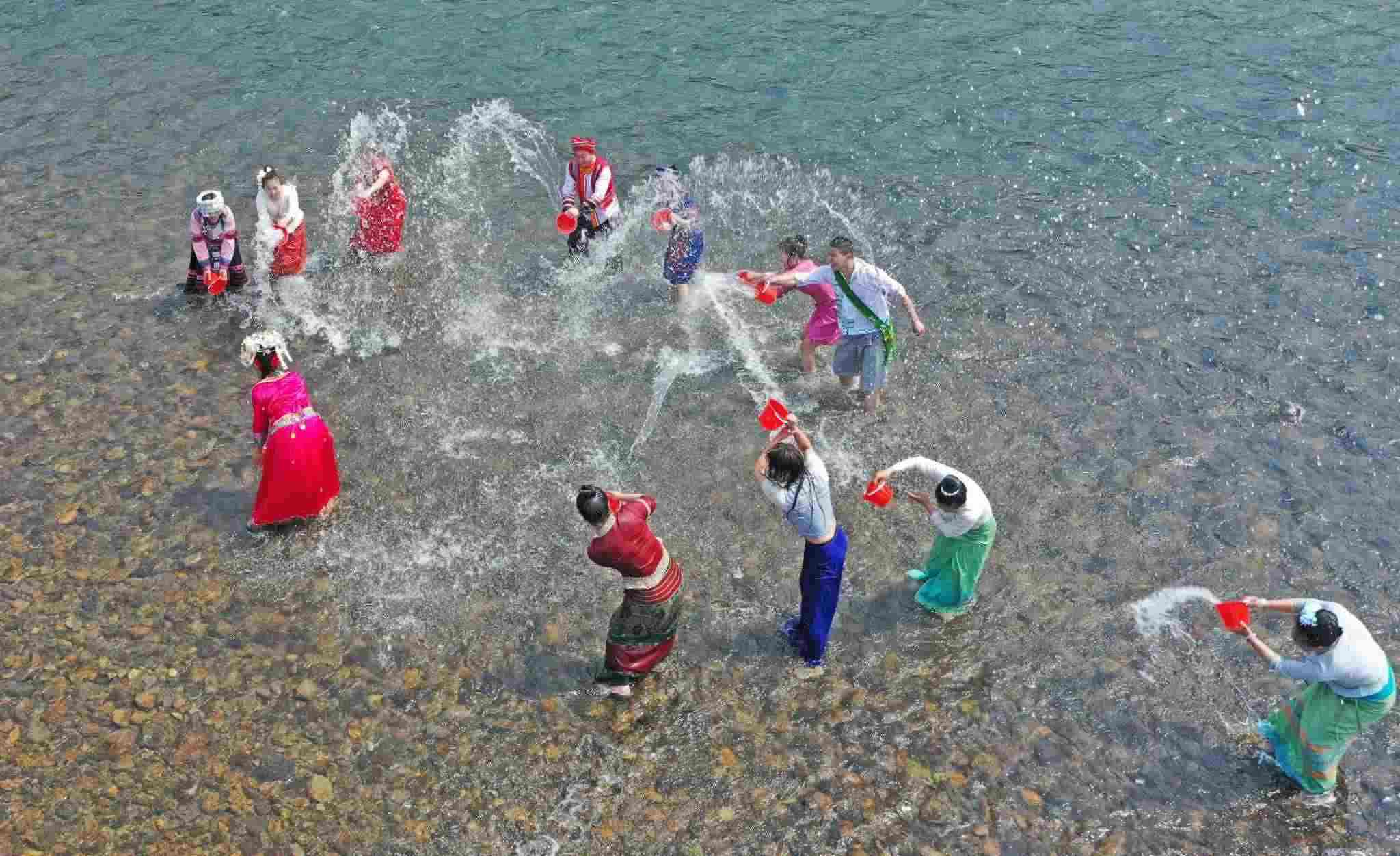 2023年4月12日,浙江臺(tái)州,仙居縣永安溪畔,傣族同胞正在參加潑水狂歡活動(dòng)。視覺(jué)中國(guó)