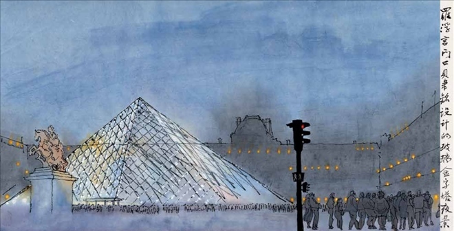 羅浮宮門口貝聿銘設(shè)計的玻璃金字塔夜景 35cm×68cm 1993 年