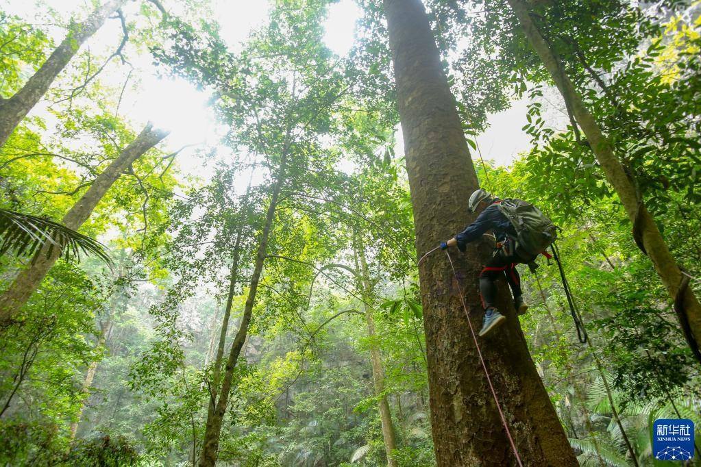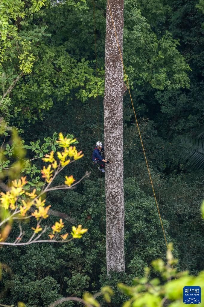 3月15日,南寧藍(lán)天救援隊(duì)的黃賢銘在攀爬望天樹(shù),準(zhǔn)備安裝測(cè)量樹(shù)高的超聲波信標(biāo)。