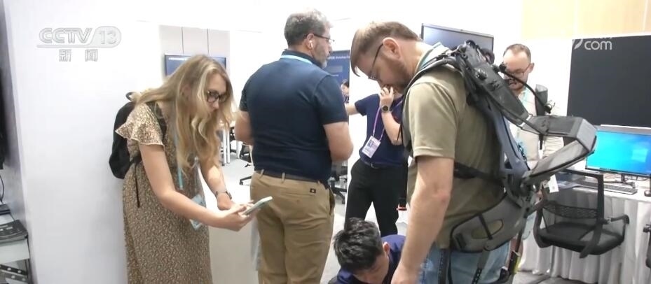 在新設(shè)的工業(yè)自動化及智能制造新展區(qū),一位在剛果(金)經(jīng)營礦場的采購商正在試穿一款外骨骼產(chǎn)品,這款智能設(shè)備可以幫助實現(xiàn)減輕30%到70%的負重。