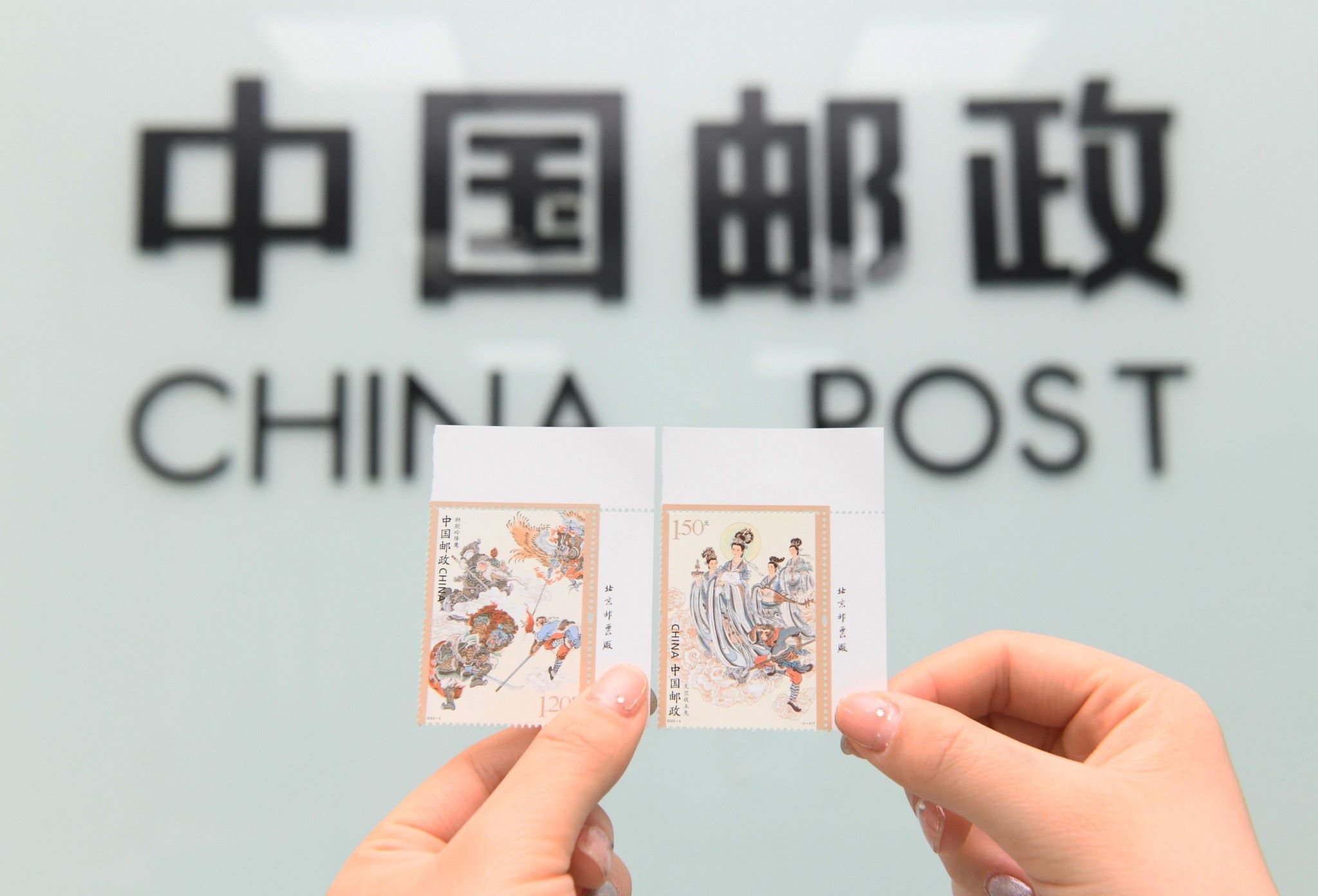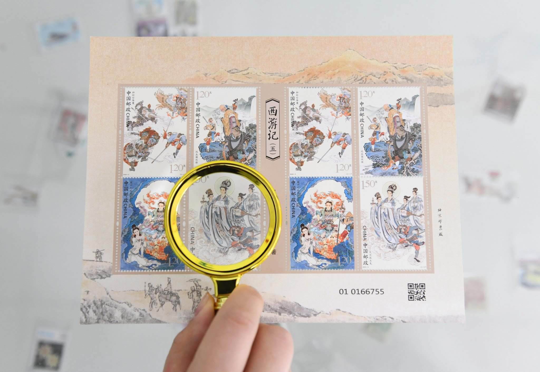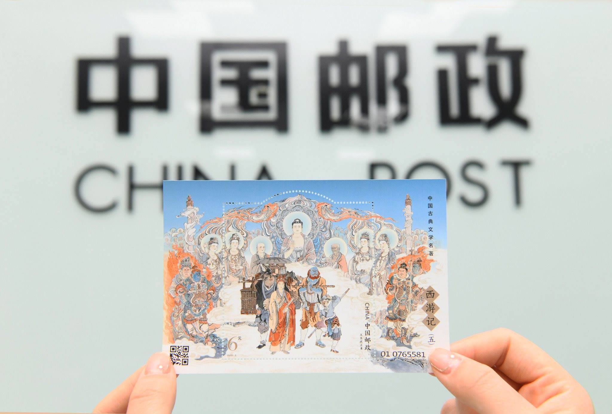 2023年4月27日,中國(guó)郵政集團(tuán)公司河北省新樂市分公司,工作人員展示發(fā)行的《中國(guó)古典文學(xué)名著—<西游記>(五)》特種郵票。視覺中國(guó)
