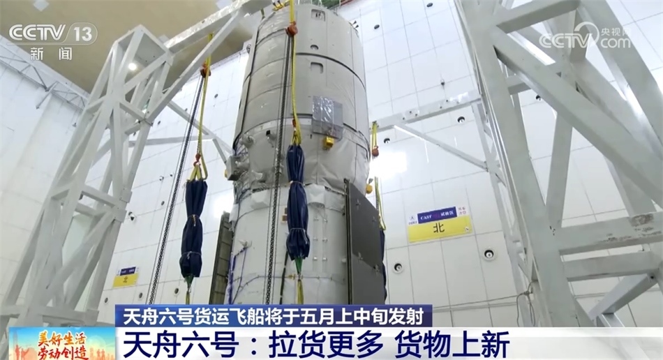 總臺(tái)央視記者 陶嘉樹:在我身后的就是天舟貨運(yùn)飛船,它整個(gè)的長(zhǎng)度是10.6米,整體分成兩個(gè)部分,下面比較小的這一部分是它的推進(jìn)艙,上面比較大的部分是它的貨物艙。天舟貨運(yùn)飛船總重13.5噸,從天舟六號(hào)開始,它的載貨量從以前的6.9噸提高到了7.4噸,是目前世界上運(yùn)貨能力最強(qiáng)的貨運(yùn)飛船之一。