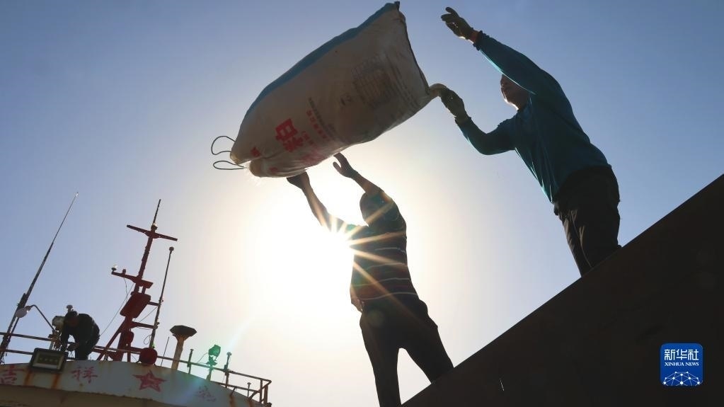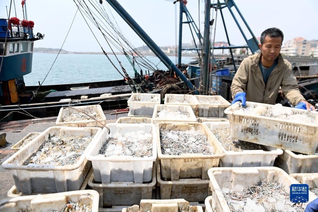 4月30日,在山東青島西海岸新區(qū)積米崖漁港,漁民從漁船上卸載漁獲。