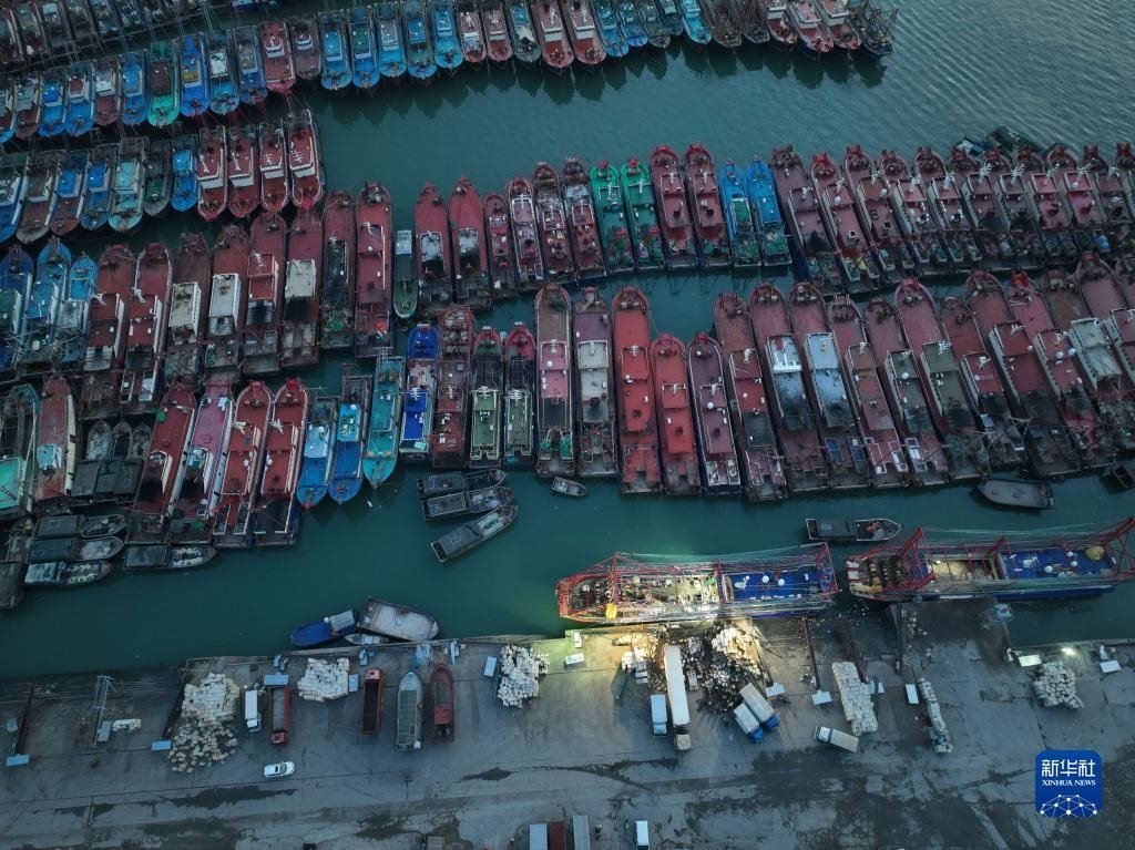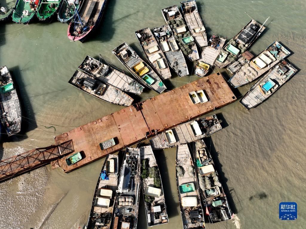 4月30日,在江蘇省連云港市贛榆區(qū)青口漁港碼頭,漁民在卸載漁具,為即將到來的伏季休漁做準(zhǔn)備(無人機照片)。