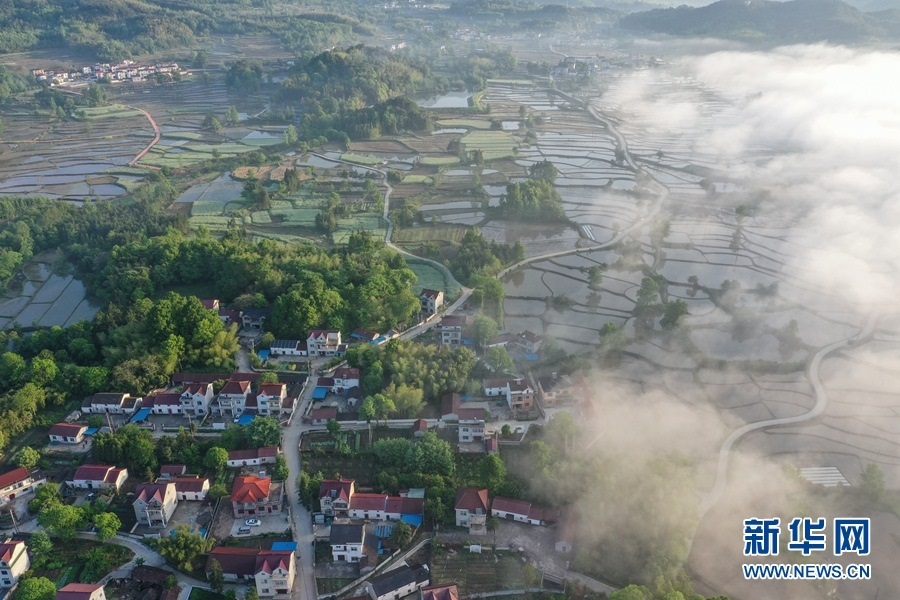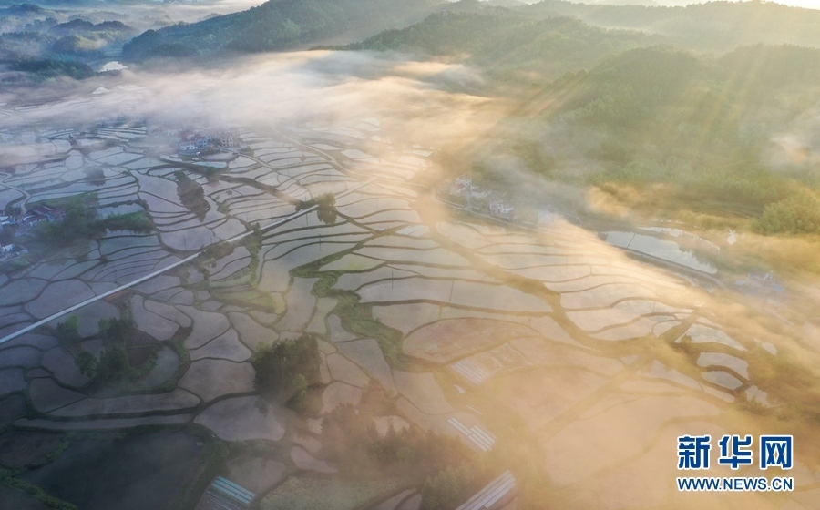 春日清晨,航拍安徽省宣城市旌德縣興隆鎮(zhèn)三山村,線條優(yōu)美的梯田、若隱若現的村莊、濃淡相宜的云霧、變幻莫測的朝霞,描繪出一幅幅美麗的鄉(xiāng)村畫卷。