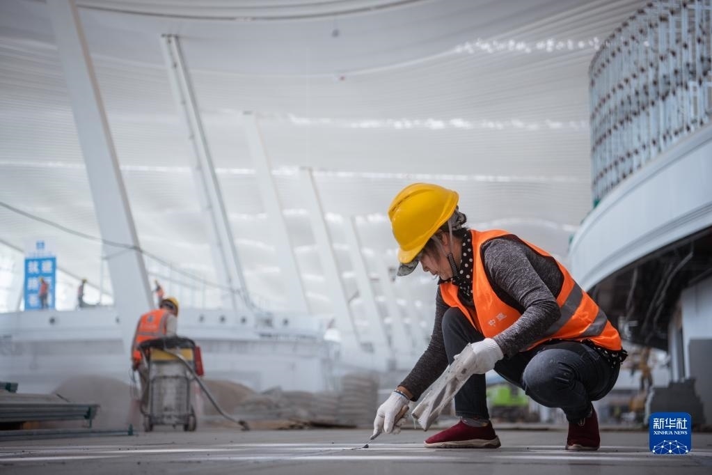 5月1日,在中建三局承建的武漢天河機(jī)場T2航站樓改造工程項(xiàng)目工地,工人在進(jìn)行樓地面施工作業(yè)。
