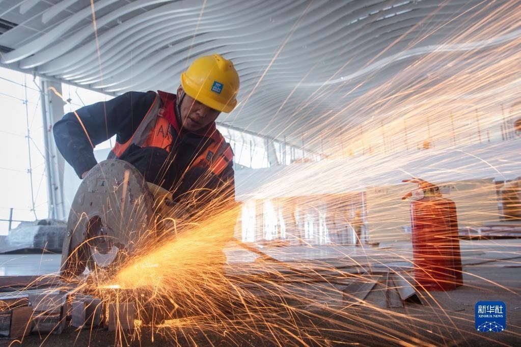 5月1日,在中建三局承建的武漢天河機(jī)場T2航站樓改造工程項(xiàng)目工地,工人在切割材料。