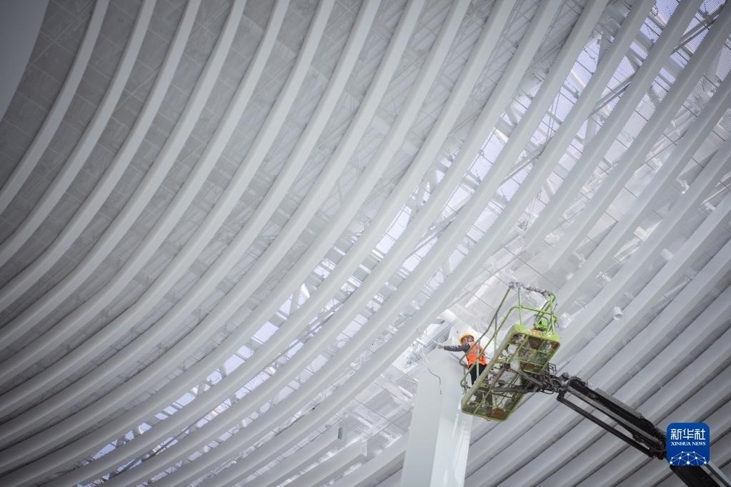 5月1日,在中建三局承建的武漢天河機(jī)場T2航站樓改造工程項(xiàng)目工地,工人在檢查吊頂內(nèi)管線。