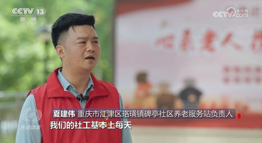 重慶市江津區(qū)珞璜鎮(zhèn)碑亭社區(qū)養(yǎng)老服務站負責人夏建偉:“一天下來,滿滿當當?shù)模覀兊纳绻せ旧厦刻於汲^了兩萬三千步的樣子。雖然說很累,但是每一個社工都很愉快,都覺得在這個過程當中找到了快樂,也找到了成就感。”