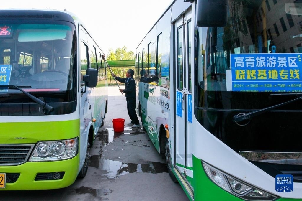 4月29日,在淄博市高青縣客運站,一名司機(jī)在保養(yǎng)車輛。當(dāng)?shù)赝瞥?元“燒烤公交”專線方便游客出行。