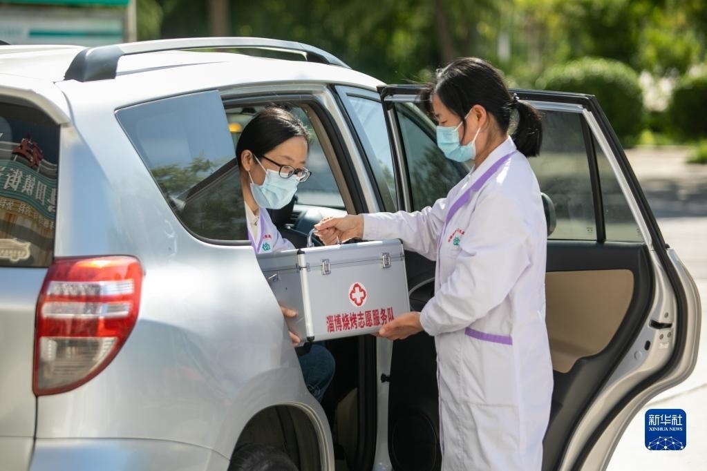 4月30日,在淄博市高青縣田鎮(zhèn)街道,志愿者備好常用藥品準(zhǔn)備乘車前往一個燒烤服務(wù)點工作。