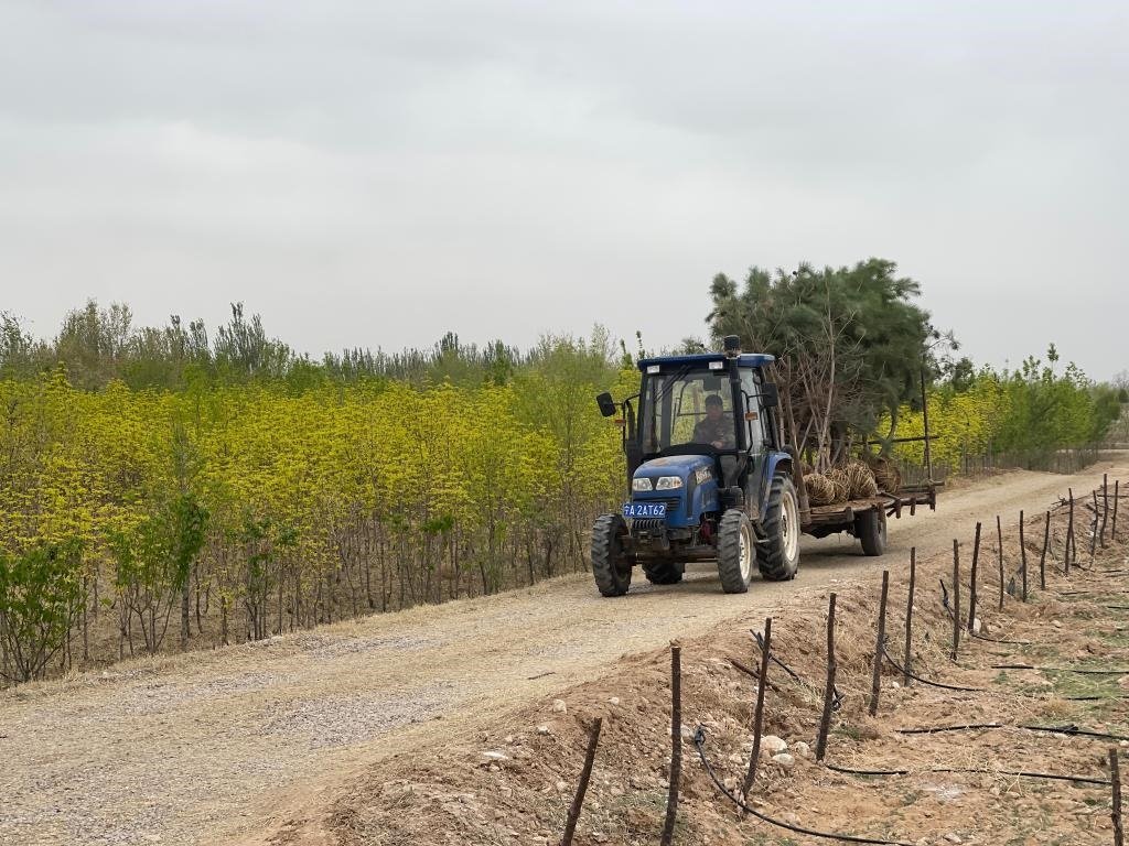 寧夏靈武白芨灘國(guó)家級(jí)自然保護(hù)區(qū)馬鞍山林場(chǎng)內(nèi),一輛拖拉機(jī)在運(yùn)送樹(shù)苗。新華社記者蘇醒 攝