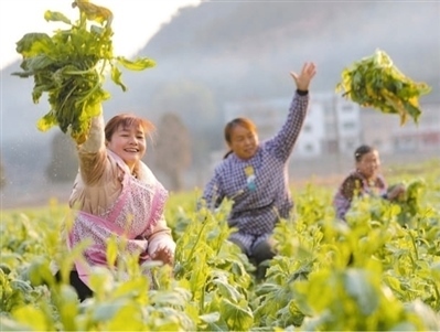 貴州省黔東南苗族侗族自治州岑鞏縣關莊村芥菜種植基地,村民們在采收芥菜。胡攀學攝(人民視覺)