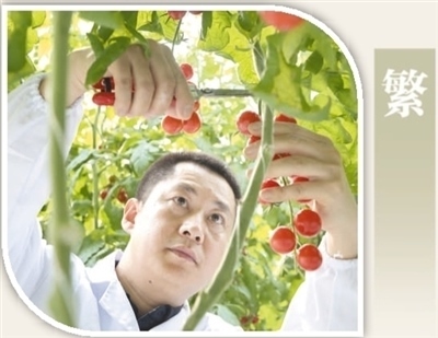 江蘇省昆山市陸家鎮(zhèn)未來農業(yè)示范園中,技術人員在采摘新選育出的西紅柿品種。許叢軍攝(人民視覺)