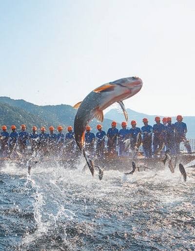 浙江省杭州市淳安縣千島湖國家級水產種質資源保護區(qū)內,漁民在進行“巨網捕魚”。謝航凱攝(影像中國)