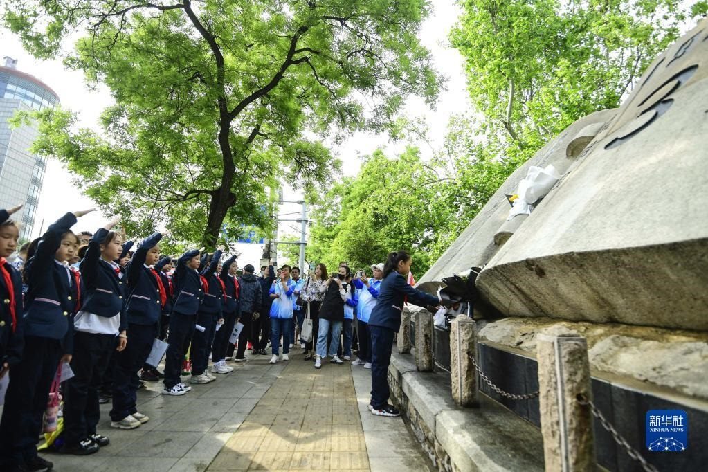 5月3日,小學(xué)生在“五三慘案”紀念碑前獻花。