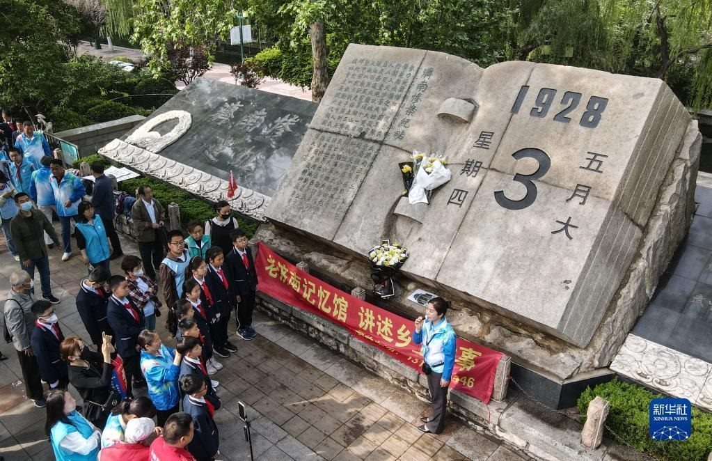 5月3日,小學(xué)生在“五三慘案”紀念碑前聽志愿者講述歷史。
