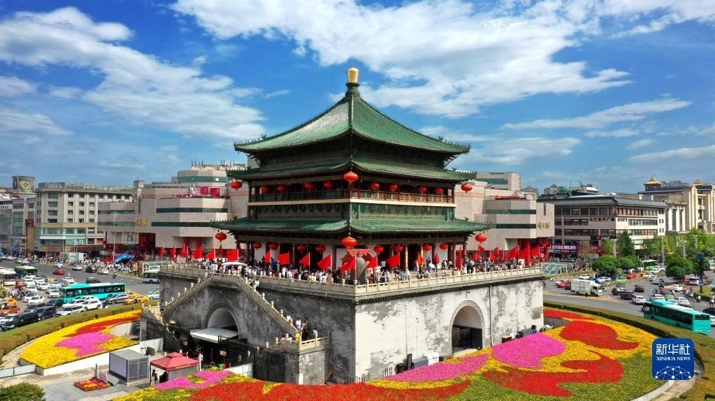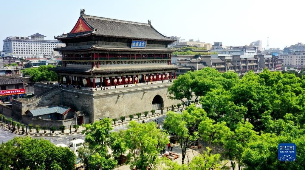 西安鐘樓(5月1日攝,無人機照片)。