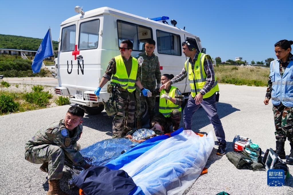 5月3日,在黎巴嫩南部邊境“藍(lán)線”附近雷場(chǎng),參與演習(xí)的中國(guó)第21批赴黎巴嫩維和多功能工兵分隊(duì)隊(duì)員同外軍醫(yī)療分隊(duì)交接。