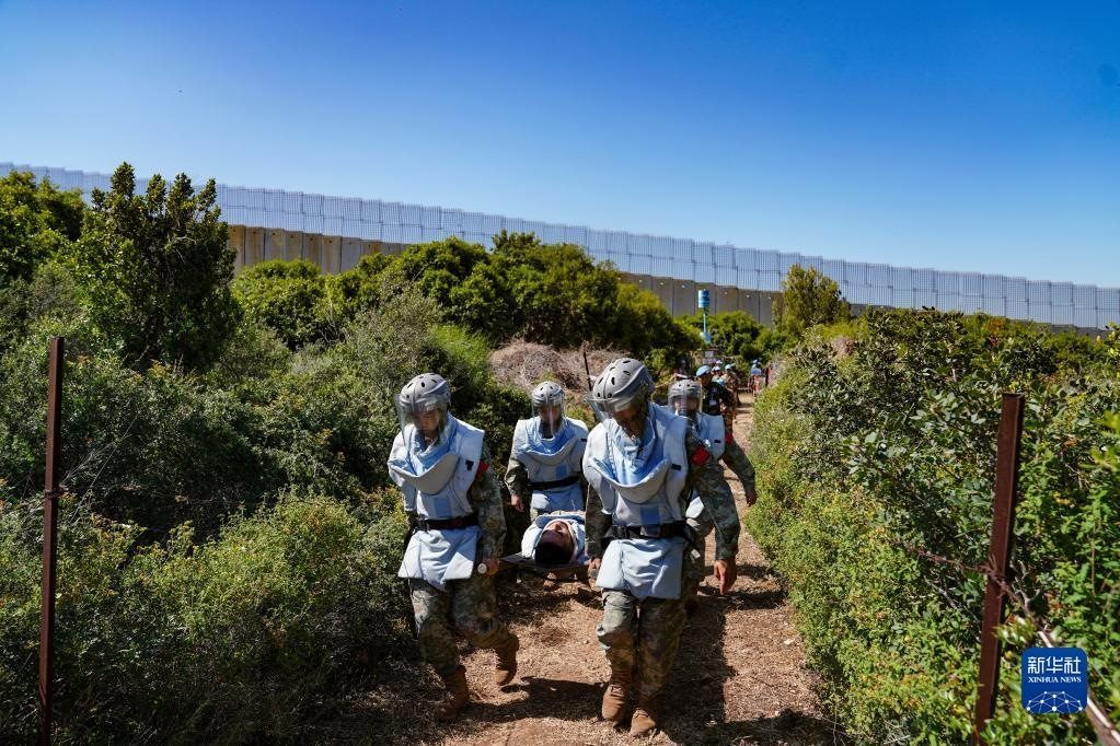 5月3日,在黎巴嫩南部邊境“藍(lán)線”附近雷場(chǎng),參與演習(xí)的中國(guó)第21批赴黎巴嫩維和多功能工兵分隊(duì)隊(duì)員將“傷員”轉(zhuǎn)運(yùn)出雷場(chǎng)。