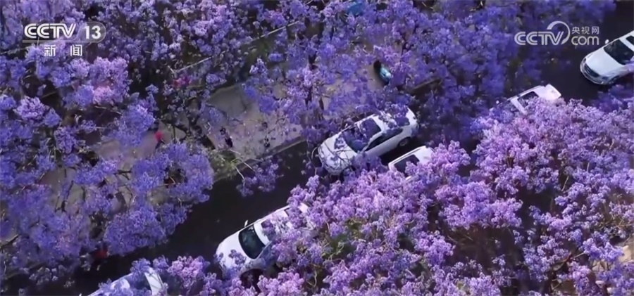 總臺記者 郭琳潔:我現(xiàn)在是在昆明的教場中路,5月上旬,道路兩側(cè)的藍(lán)花楹競相綻放,將這條1.4公里長的道路裝扮成一條紫色長廊。