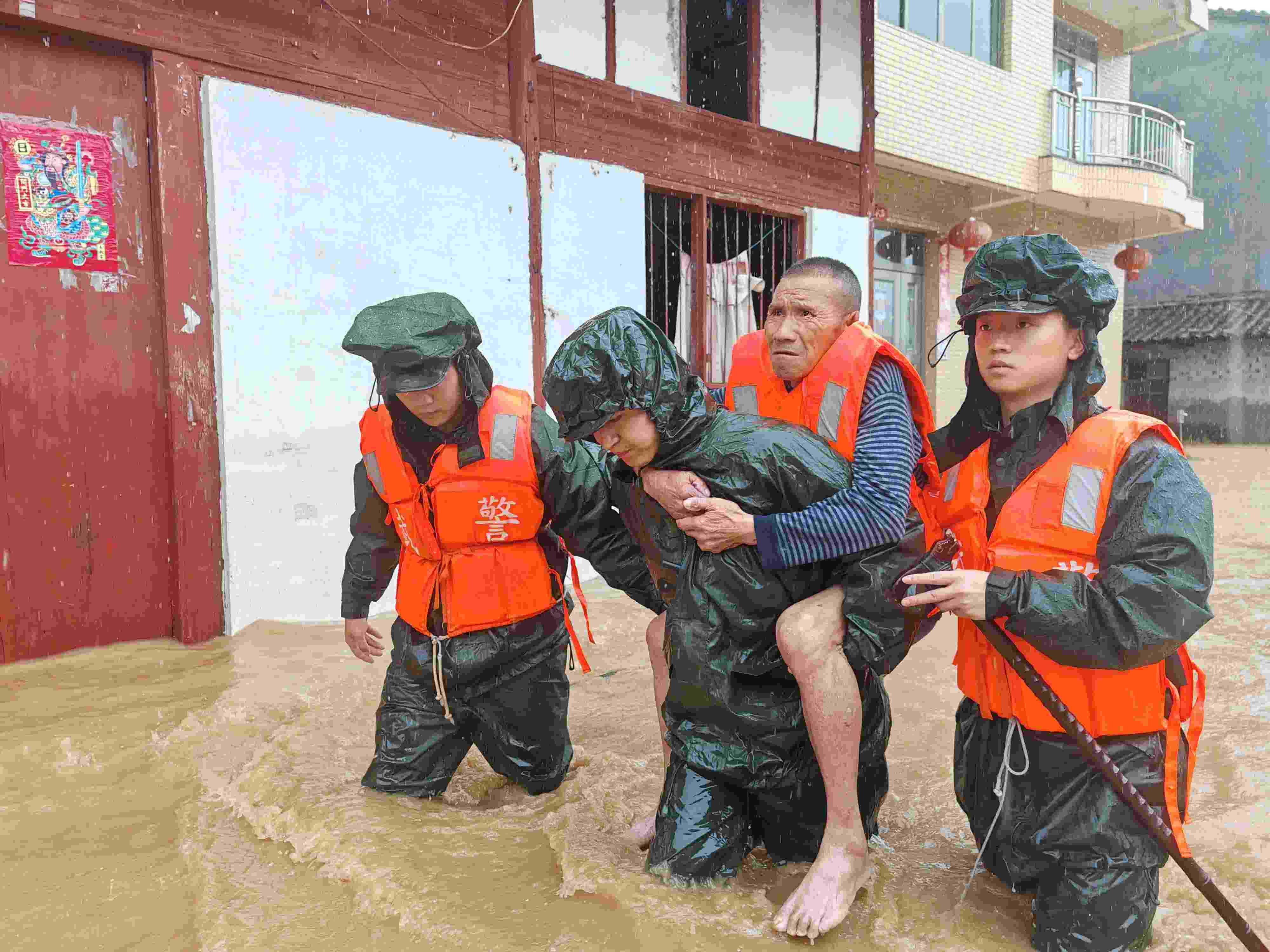2023年5月6日,江西撫州,宜黃縣梨溪鎮(zhèn),武警撫州支隊官兵在轉(zhuǎn)移被困群眾。 視覺中國