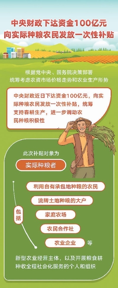 為此,國家統(tǒng)籌考慮農(nóng)資市場價(jià)格走勢和農(nóng)業(yè)生產(chǎn)形勢,中央財(cái)政向?qū)嶋H種糧農(nóng)民發(fā)放一次性補(bǔ)貼100億元,以穩(wěn)定農(nóng)民收入、保護(hù)農(nóng)民種糧積極性。