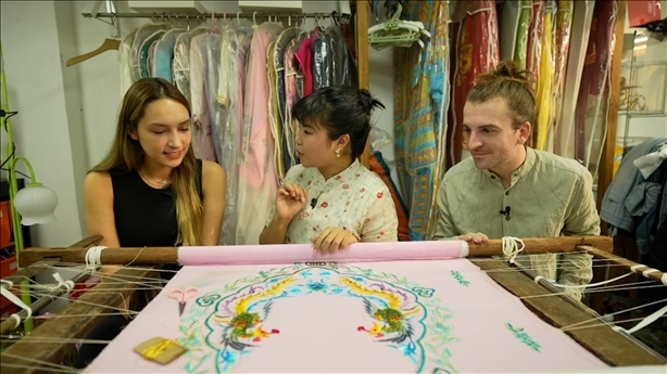 “老板,我是來(lái)做戲服模特”“我來(lái)考察非遺文化項(xiàng)目”美國(guó)的潘明花和意大利徐天佑一起來(lái)到狀元坊戲服工廠,戲服刺繡傳承人何鳳婷熱情地講述著戲服刺繡的歷史、制作工序、角色樣式,也讓他們親自體驗(yàn)了刺繡。潘明花驚嘆于刺繡工藝遠(yuǎn)比想象中要復(fù)雜得多。他們穿著戲服走近粵劇博物館,深入了解以粵劇為代表的嶺南文化。徐天佑表示戲服刺繡非遺的傳承不僅是技術(shù)工藝的傳承,同時(shí)也是文化的傳承。何鳳婷說(shuō)如何讓更多年輕人喜愛和關(guān)注這項(xiàng)手藝,如何能繼續(xù)傳承下去是目前亟待解決的問(wèn)題。為了讓刺繡與現(xiàn)代審美相結(jié)合,老板將刺繡工藝與年輕人喜愛的IP玩偶組合,將“激活非遺+創(chuàng)新思路+文化傳承”理念融入到刺繡中,讓這門手藝更面向大眾,推動(dòng)非遺的創(chuàng)造性轉(zhuǎn)化,提高與現(xiàn)代生活的緊密度,成為融入現(xiàn)代生活中的潮流元素,讓非遺重?zé)ü獠省?/p>