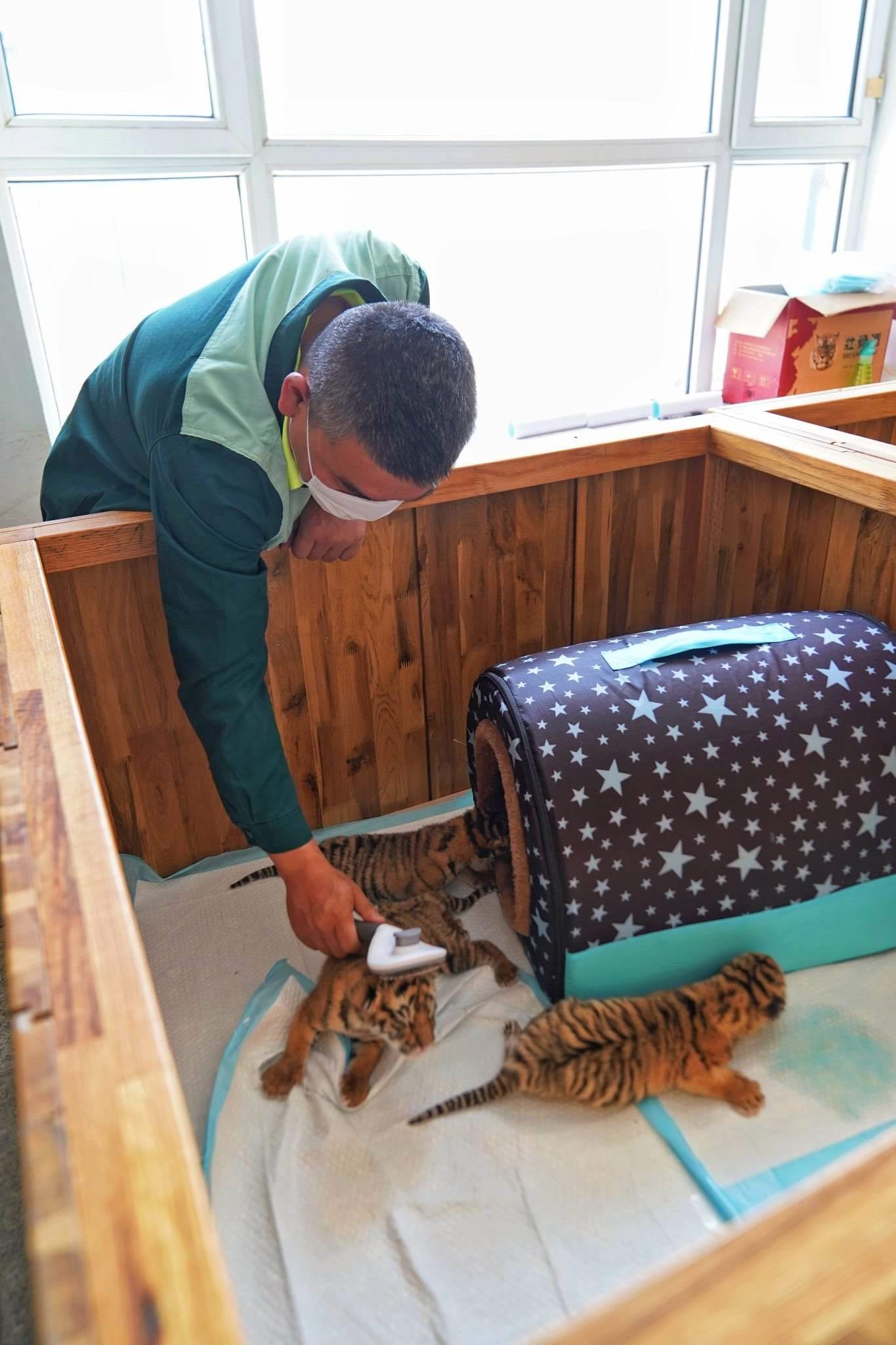 近日,14只東北虎幼崽降生黑龍江東北虎林園。據(jù)飼養(yǎng)員介紹,目前幼虎們身體狀況均良好,待產(chǎn)室內(nèi)還有多只母虎即將在本月生產(chǎn)。視覺(jué)中國(guó)