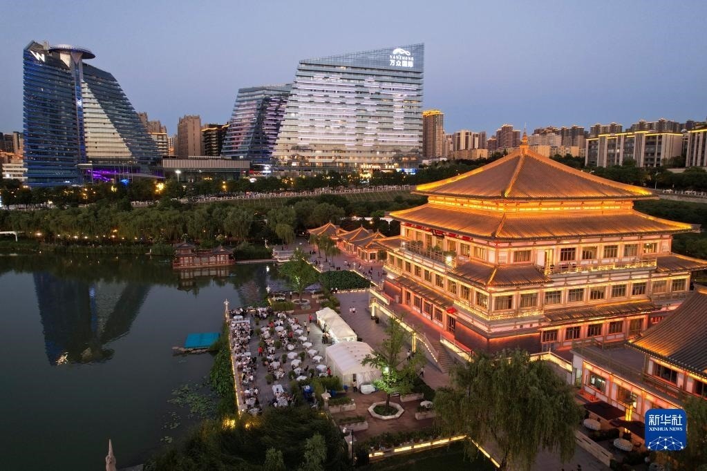 西安曲江新區(qū)日落時(shí)分的城市景色(2022年6月14日攝,無(wú)人機(jī)照片)。