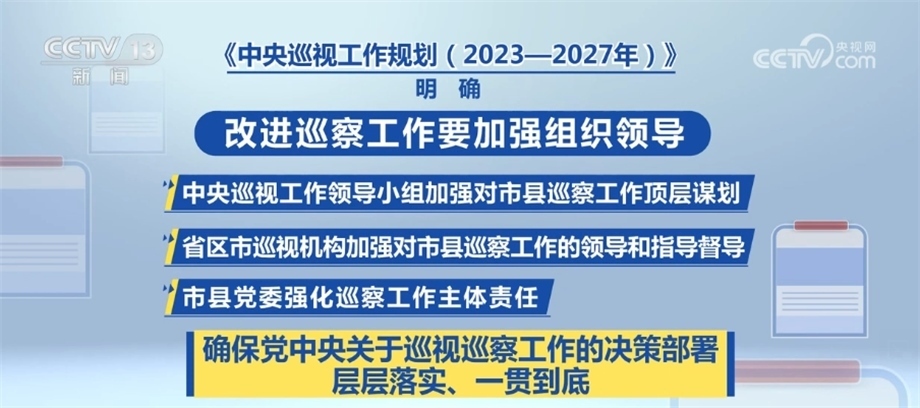 《中央巡視工作規(guī)劃(2023—2027年)》明確,改進(jìn)巡察工作要加強(qiáng)組織領(lǐng)導(dǎo)。中央巡視工作領(lǐng)導(dǎo)小組加強(qiáng)對(duì)市縣巡察工作頂層謀劃,省區(qū)市巡視機(jī)構(gòu)加強(qiáng)對(duì)市縣巡察工作的領(lǐng)導(dǎo)和指導(dǎo)督導(dǎo),市縣黨委強(qiáng)化巡察工作主體責(zé)任,確保黨中央關(guān)于巡視巡察工作的決策部署層層落實(shí)、一貫到底。