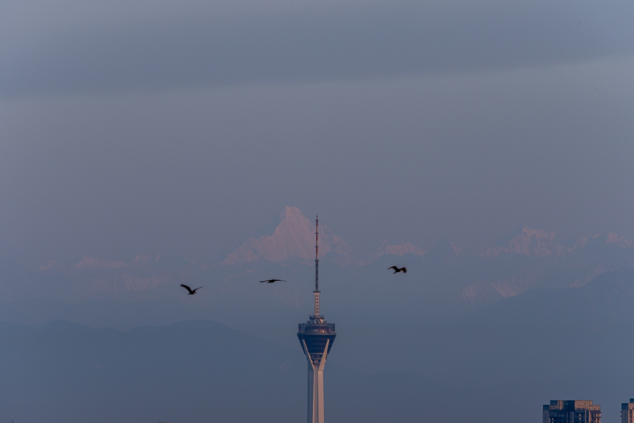 成都:幺妹峰露出真容 與城市建筑同框
