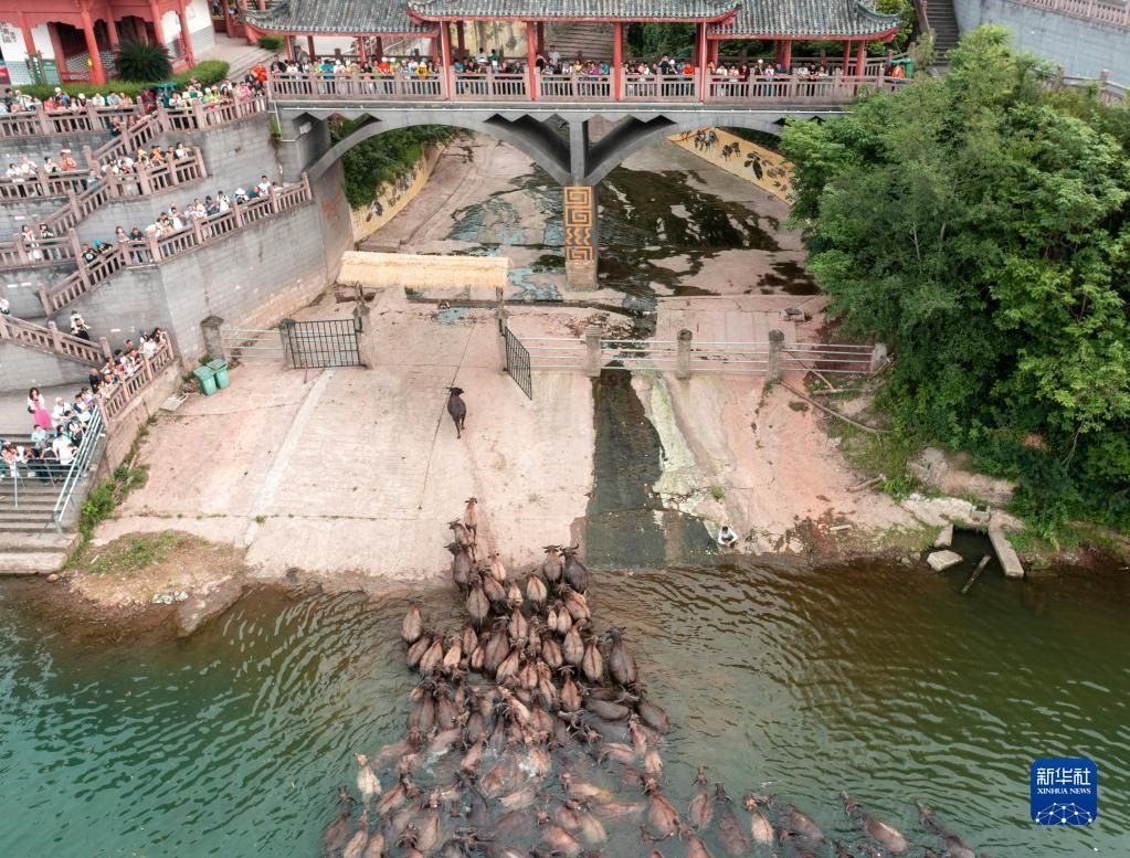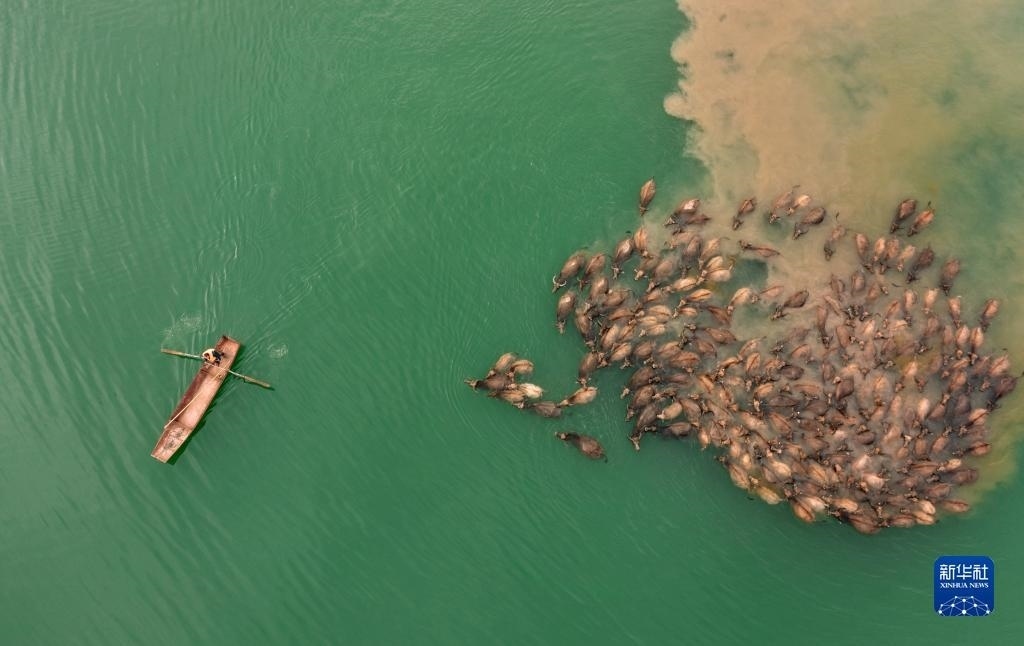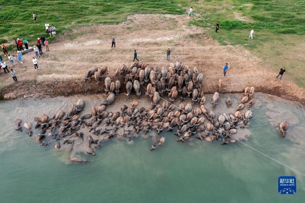 5月13日,在南充市蓬安縣相如鎮(zhèn)油房溝村嘉陵江段,成群結(jié)隊(duì)的水牛渡江(無(wú)人機(jī)照片)。