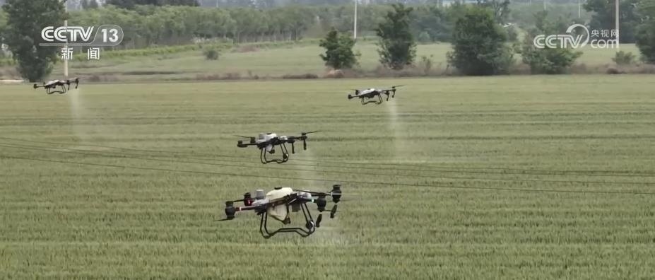 在山西運城,439萬畝小麥從北到南陸續(xù)進入揚花灌漿關鍵期,農(nóng)技人員在田間地頭給予農(nóng)戶技術(shù)指導。在運城河津市村民馬關發(fā)的小麥田里,10架無人機正在麥田上方進行噴灑作業(yè)。
