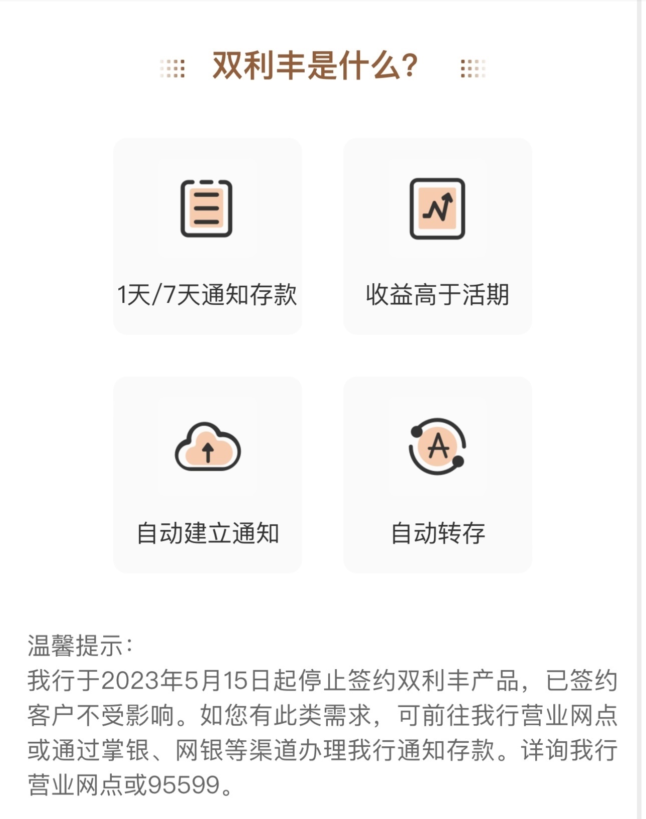 農(nóng)業(yè)銀行App顯示,該行存款專區(qū)中的智能通知存款產(chǎn)品“雙利豐”于5月15日起停止簽約,已簽約客戶不受影響。農(nóng)行表示,如有此類需求,可前往營業(yè)網(wǎng)點或通過掌銀、網(wǎng)銀等渠道辦理通知存款。