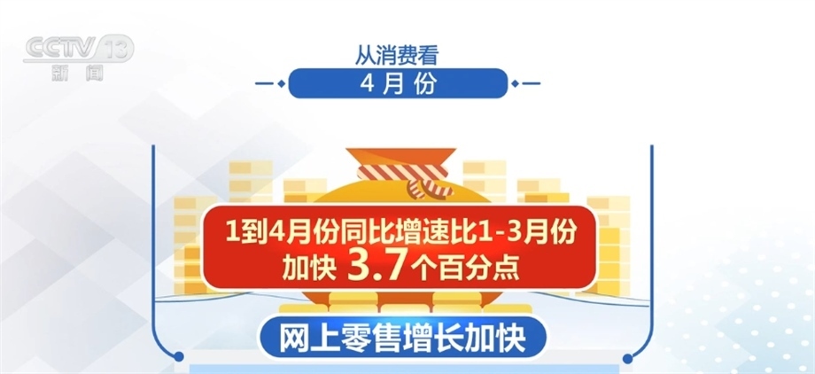 從消費(fèi)看,4月份,社會(huì)消費(fèi)品零售總額同比增長(zhǎng)18.4%,比上月加快7.8個(gè)百分點(diǎn)。其中,網(wǎng)上零售增長(zhǎng)加快,1—4月份同比增速比1—3月份加快3.7個(gè)百分點(diǎn)。