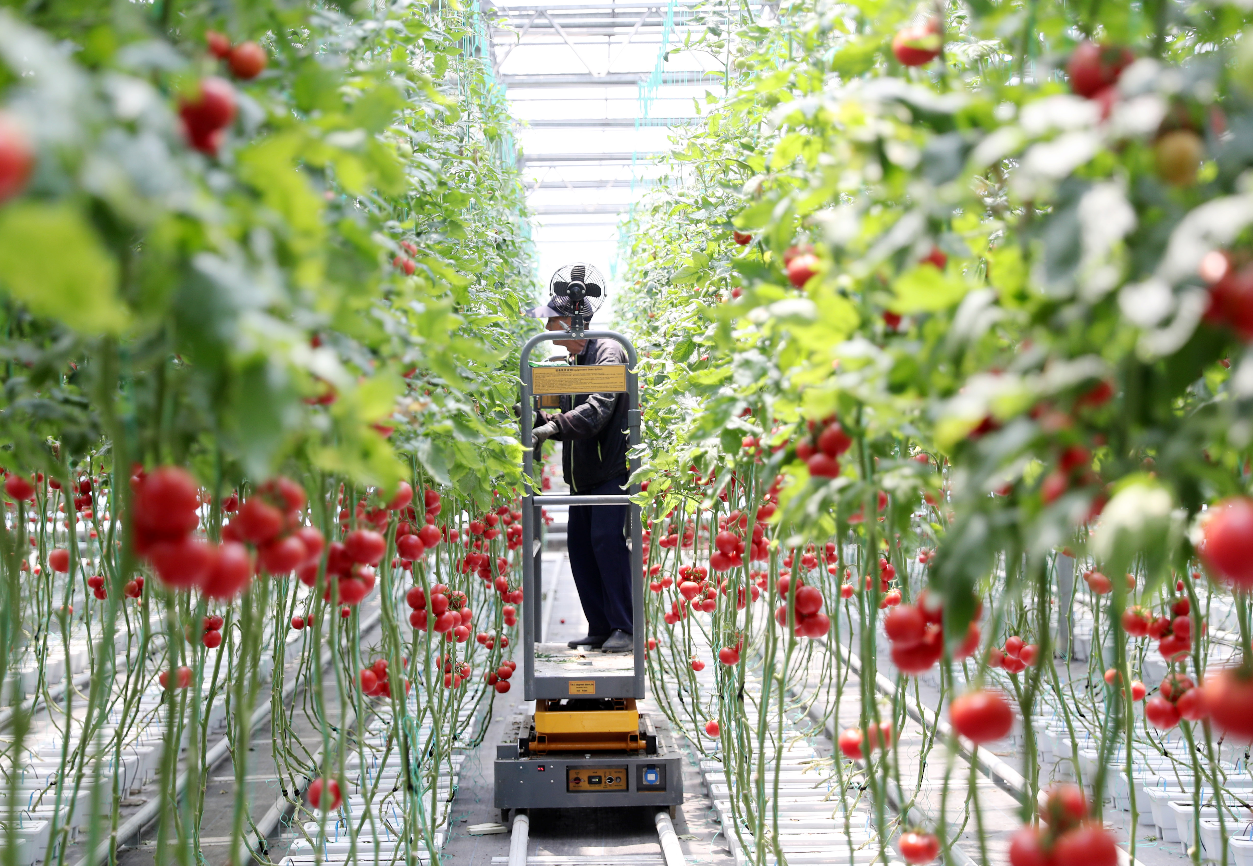 5月15日,村民在青島市即墨區(qū)北安街道一家智慧農場內采摘西紅柿供應市場。 張進剛 攝