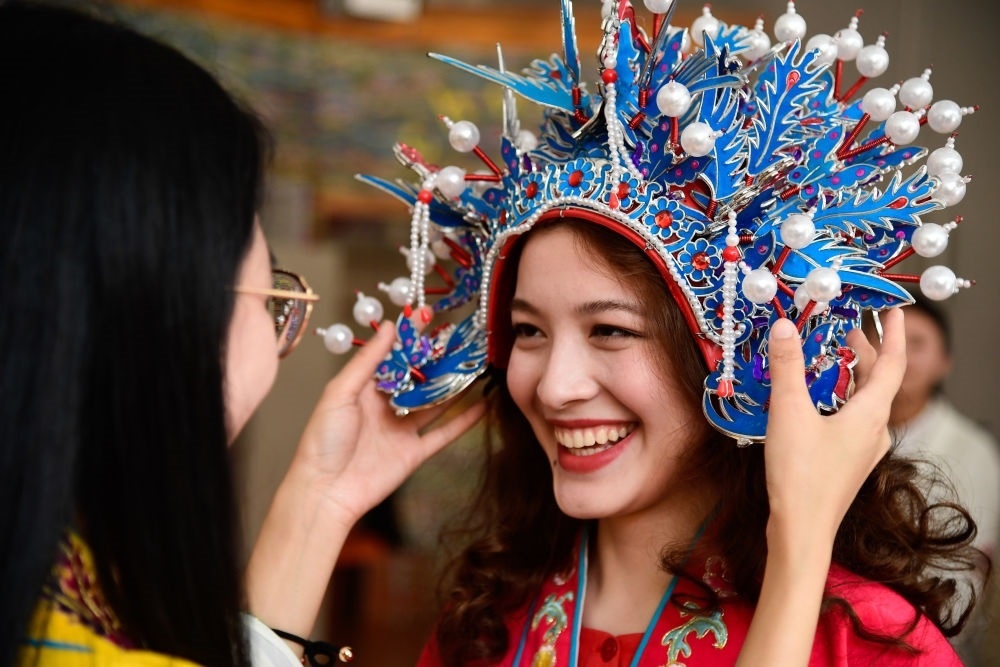 在青島的中國石油大學(xué)(華東)大學(xué)生活動(dòng)中心,哈薩克斯坦留學(xué)生珍珠體驗(yàn)京劇文化(2018年5月3日攝)