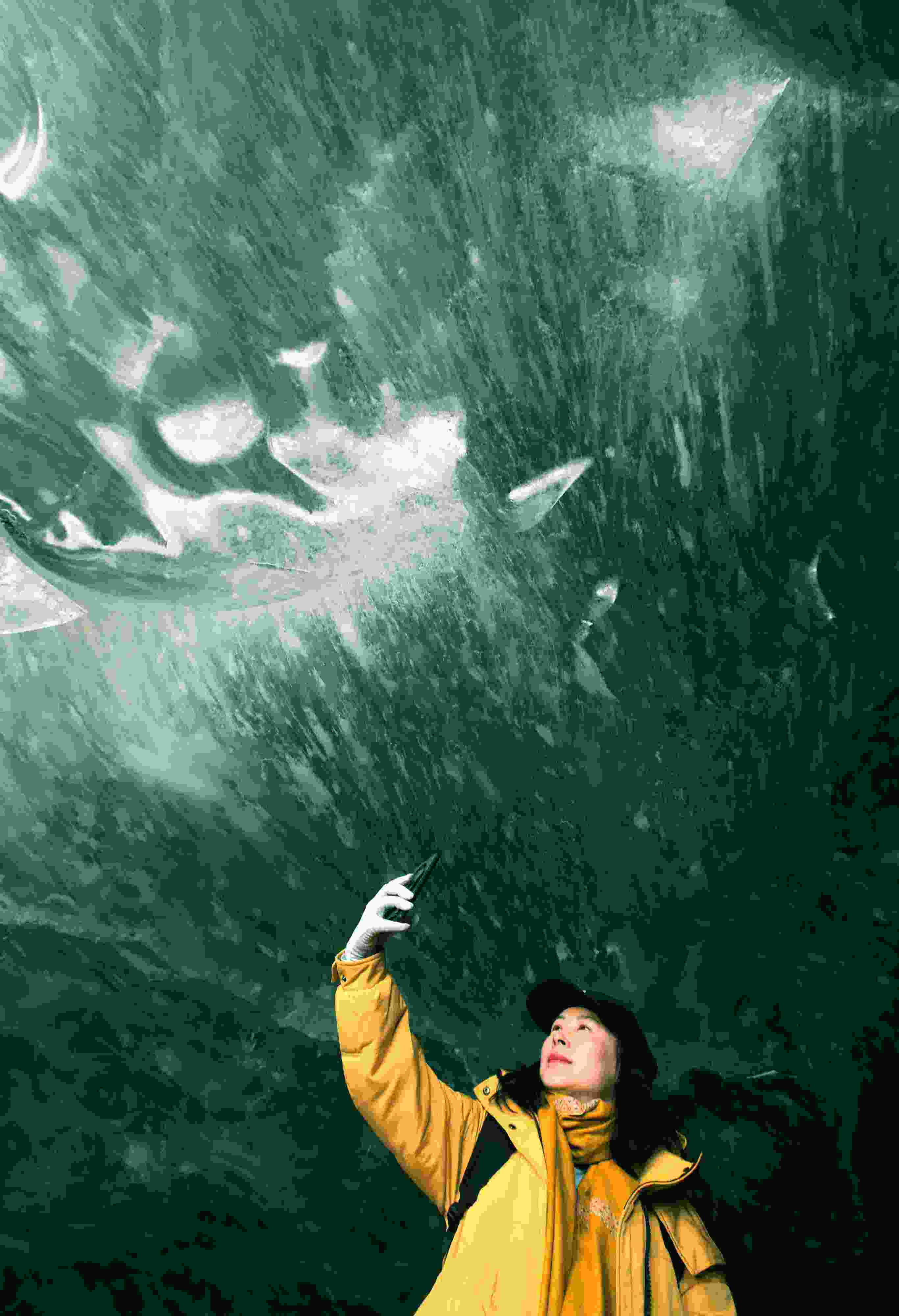 2023年5月21日,西藏昌都,游客在邊壩縣普玉一村游覽冰洞。據(jù)初步勘測(cè),貫穿的冰洞長(zhǎng)約165米、寬約26米、高約15米。呈弧拱造型的冰洞內(nèi)壁上皆是晶瑩剔透的冰柱、冰簾、冰花,其頂部呈“魚鱗”狀,在陽(yáng)光的照射下,呈現(xiàn)出夢(mèng)幻般的景象。 視覺(jué)中國(guó)