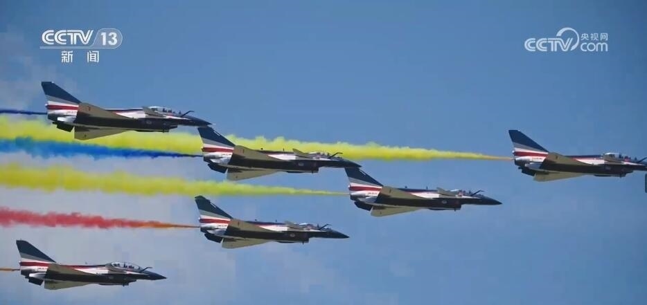 隨著滑出指令下達,噴著五星紅旗涂裝的6架表演機緩緩駛向起飛線。6架表演機在云底高度1000米氣象條件下依次起飛,在空中迅速集結(jié)組成箭形編隊。以人字形編隊低空通場,在空中以六道絢麗彩煙,以特殊禮儀向現(xiàn)場致以最崇高的敬意。