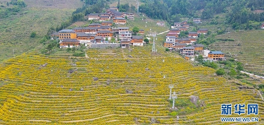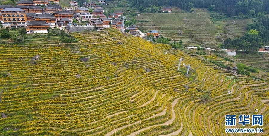 5月,在廣西桂林市龍勝縣泗水鄉(xiāng),近千畝連綿一片的布尼梯田已花開成海,絢麗多彩的花海梯田吸引游客前來打卡拍照。 (伍春媛)