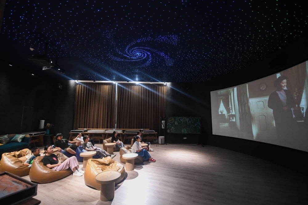 居民在位于浙江省杭州市富陽區(qū)銀湖街道硅谷社區(qū)的“合之舍”書房的影視廳觀看電影,該書房是銀湖街道“15分鐘品質(zhì)文化生活圈”的示范點位(2022年7月2日攝)。新華社記者 徐昱 攝