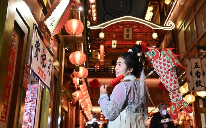 身穿傳統(tǒng)服飾的游客在陜西省西安市“長安十二時辰”主題街區(qū)游玩(2023年1月24日攝)。新華社記者 劉瀟 攝