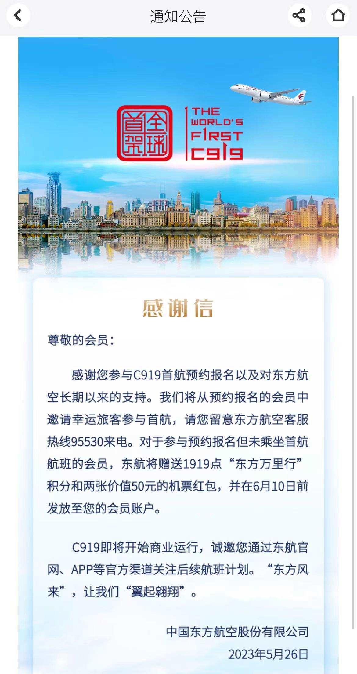 東航APP上還發(fā)布了一則感謝信,信中表示,C919即將開始商業(yè)運(yùn)行,東航將從預(yù)約報(bào)名的會(huì)員中邀請幸運(yùn)旅客參與首航,對于參與預(yù)約報(bào)名但未乘坐首航航班的會(huì)員,東航將贈(zèng)送1919點(diǎn)“東方萬里行”積分和兩張價(jià)值50元的機(jī)票紅包,并在6月10日前發(fā)放至?xí)T賬戶。