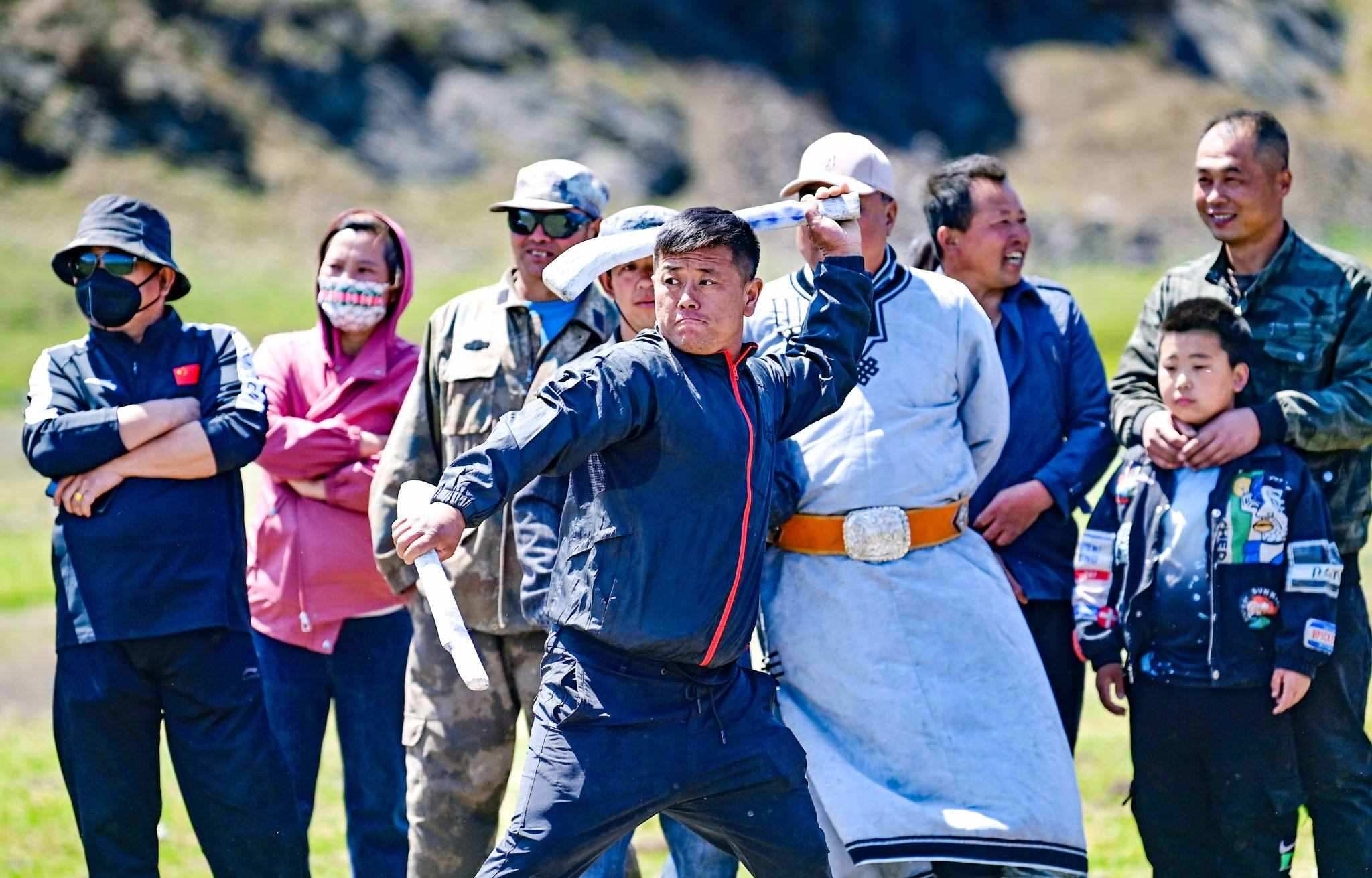 2023年5月26日,內(nèi)蒙古興安盟,科爾沁右翼前旗德伯斯鎮(zhèn)阿日林一合嘎查舉行首屆那達(dá)慕,設(shè)置的賽馬、布魯、搏克、拔河等傳統(tǒng)體育娛樂項(xiàng)目,吸引嘎查周邊500余名牧民參加比賽,喜慶牧業(yè)豐收季。視覺中國(guó)