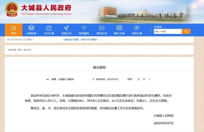 ·河北大城一派出所煙花爆竹取樣鑒定時(shí)發(fā)生爆炸,已致4死2失聯(lián),5人正在救治。