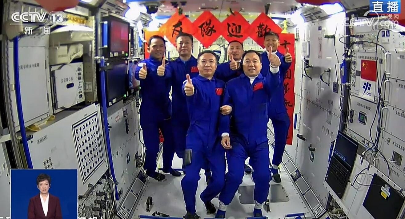 央視網(wǎng)消息:宇宙星河浪漫,探索永不止步。今天(5月30日)9時(shí)31分,搭載神舟十六號(hào)載人飛船的長征二號(hào)F遙十六運(yùn)載火箭在酒泉衛(wèi)星發(fā)射中心點(diǎn)火發(fā)射,發(fā)射任務(wù)取得圓滿成功。神舟十六號(hào)航天員景海鵬、朱楊柱、桂海潮順利進(jìn)入太空。神舟十六號(hào)載人飛船入軌后,在16時(shí)29分成功對(duì)接于空間站天和核心艙徑向端口。之后,神舟十六號(hào)航天員乘組從飛船返回艙進(jìn)入軌道艙。翹盼已久的神舟十五號(hào)航天員乘組打開“家門”,歡迎遠(yuǎn)道而來的神舟十六號(hào)航天員乘組入駐“天宮”。