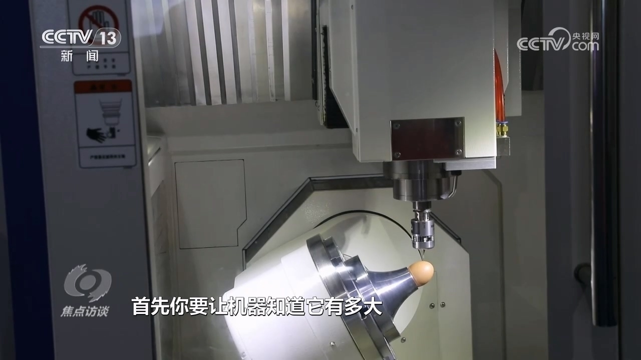 北京中關村精雕智造科技創(chuàng)新中心副總經理楊錳:“一個是識別,給機床安上了一雙眼睛,能知道雞蛋長什么樣子;另外一個就是要求機床精度和穩(wěn)定性非常高,保證雞蛋永遠刻不爛、刻不破?!?/p>
